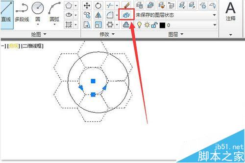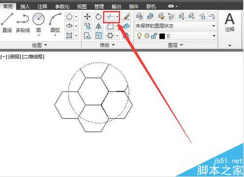 為了修剪多余部分,選中所有的多邊形,單擊分解工具把圖形打散。這一步很重要,沒有分解,就沒有辦法修剪。分解后,指定圓為界限,單擊圓外就修剪外邊的,保留園內部分。