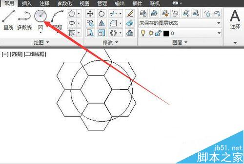 單擊常用工具欄上的橢圓工具。在擴充的圖形中畫一個圓,圓心稍微偏離中心一點,半徑選擇略小一點,使園外還有六邊形的剩余部分。