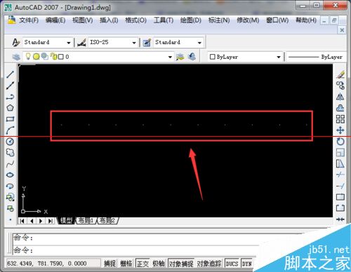 1、我們?cè)贑AD中畫出一條直線,這個(gè)直線有兩個(gè)端點(diǎn),現(xiàn)在我們要在直線上找到等間距的點(diǎn),可以使用繪圖功能。