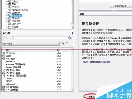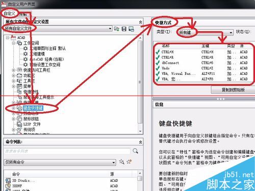 4、點(diǎn)擊“界面”后彈出了“自定義用戶界面”對話框,在其下方有“自定義”和“傳輸”兩個(gè)按鈕,切換到“自定義”按鈕,然后在“所有文件中的自定義設(shè)置”字樣下方選擇“所有自定義文件”,然后在其下方的菜單中選中“鍵盤快捷鍵”在對話框的右邊有一欄“快捷方式”,下方的“類型”中選擇“所有鍵”,“所有鍵”下方列出了各個(gè)快捷鍵的主鍵、類型、源。