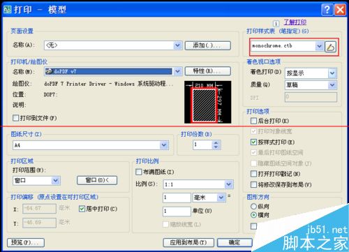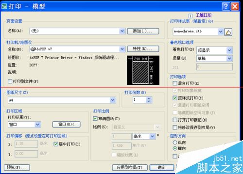 5、選擇窗口范圍、打印偏移:選擇居中、打印比例:布滿圖紙。