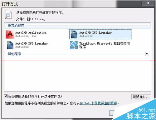 3、選擇一個".dwg"文件,右鍵→打開方式→選擇默認程序→選擇“AutoCAD DWG Launcher"→確定。