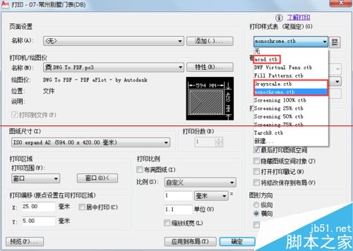 4、打印樣式表設定打印對象的顏色、線寬以及線型等打印特性。打印小圖時,可以直接選擇CAD預設的“acad.ctb”樣式進行彩色打印,或者選擇”monochrome.ctb"樣式進行黑白打印。