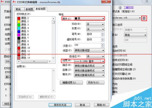 5、通常最終的圖紙都是黑白打印,并且按照行業習慣針對一些顏色設置不同的線寬,可以通過“編輯”當前的樣式表或者新建樣式表設置并保存常用的樣式設定。在樣式表編輯器中,通常的習慣是將1~255色號的顏色統一設置為黑色,再對一部分常用色號分別設置線寬,例如將1號色(紅色)的線寬設為0.13,2號色(黃色)的線寬設為0.25等。