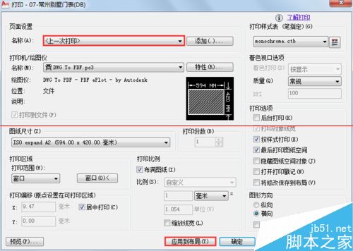 7、可以將當前設置“應用到布局”以便在后續打印中繼續使用,或者在后續打印時在頁面設置中選擇“上一次打印”避免重復設置,每次打印時僅需要窗選要打印的區域即可。