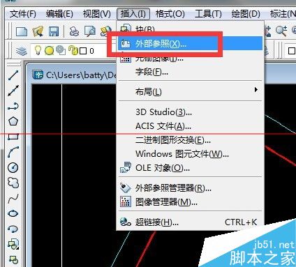 2、首先,點(diǎn)擊“菜單欄”--“插入”--“外部參照”