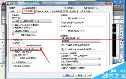 4、在彈出的選項對話頁面中,選擇打開和保存,在文件安全措施下有一個選項,每次保存時均創(chuàng)建備份副本,這外對勾去掉,然后點(diǎn)擊確定,這個圖形文件保存時,就不會有相應(yīng)的*.BAK文件了