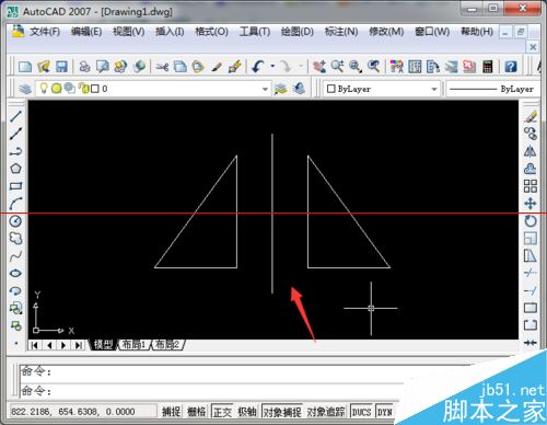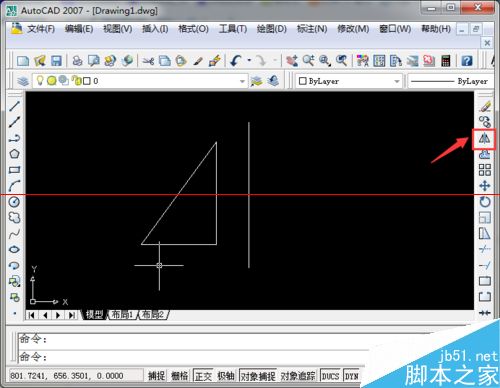 1、CAD草圖中是一條直線和三角形,需要在直線的右側(cè)畫(huà)一個(gè)三角形,與左邊對(duì)稱,有多種方法可以實(shí)現(xiàn),最簡(jiǎn)單快捷的當(dāng)然就是鏡像功能。