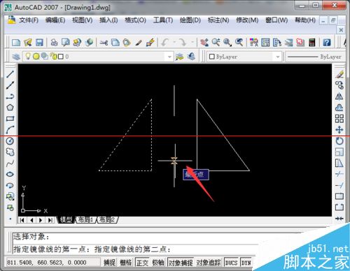 5、在指定直線的第二點(diǎn)的時(shí)候,鏡像的三角形就已經(jīng)出來(lái)了,選擇直線上的第二點(diǎn),點(diǎn)擊即可。