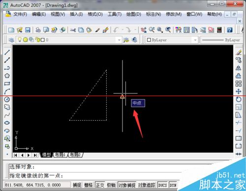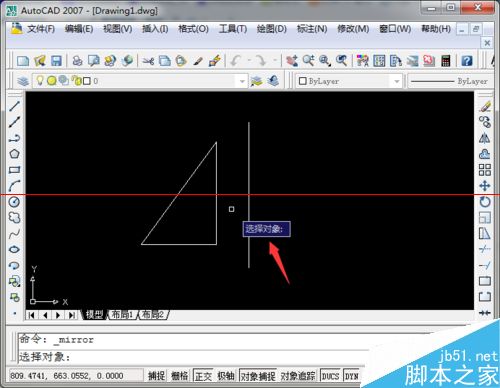 3、首先需要選擇鏡像的對(duì)象,對(duì)于本例來(lái)說(shuō),就是直線左側(cè)的三角形,點(diǎn)擊進(jìn)行選擇。