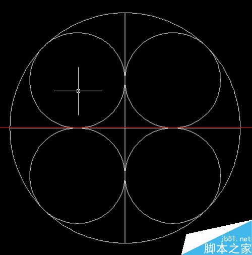 4、刪除輔助線,用同樣的辦法:繪圖——>圓——>相切,相切,相切,分別切四個小圓中的三個,畫出第五個小圓。