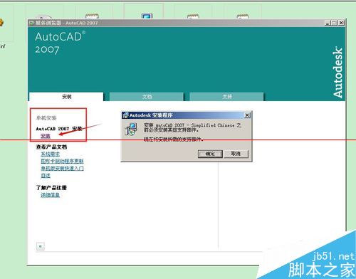 2、點擊安裝,安裝簡體中文版07CAD前必須安裝某些支持部件,直接點擊確認即可,系統會自行安裝這些支持部件。