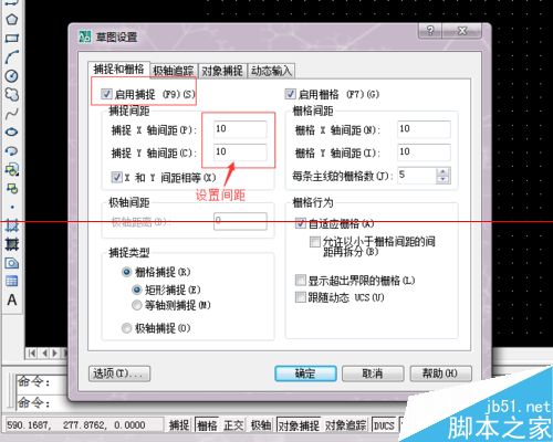 2、右鍵單擊【捕捉】按鈕,選擇【設置】,構選【啟用捕捉】就可以顯示刪了,并可以在該設置面板中設置刪格的水平距離和豎直距離。
