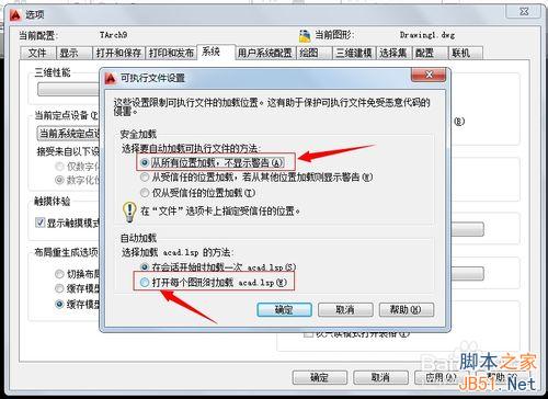 點擊打開具體設置,首先選擇第一個“從所有位置加載,不顯示警告”那么以后所有加載信息不再顯示安全提示,還有圖紙在加載的時候會自動加載圖紙的acad.lsp文件,如果以后也不需要提示那么就把下面紅色框前面的選項選中,如圖所示: