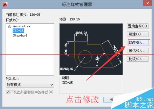 3、此時會彈出一個標注的樣式管理器,選擇樣式管理器中的修改