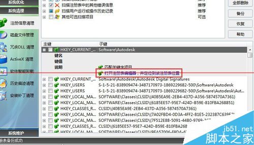 4、雖然不能通過大師進行刪除,但是可以進行注冊表位置定位,點擊搜索出來的注冊信息最前方的那個加號,可以看到“打開注冊表編輯器,并定位到該注冊表位置”字樣,點擊該行文字,自動定位到注冊表,再進行該鍵值刪除。該方式主要是用來判斷7D2F鍵值是否全部刪除完了。(注意:如果安裝有多個CAD,刪除鍵值時要注意看右邊的信息,不要刪除到其他CAD的鍵值,也就是說安裝有多個CAD時,該方式也無法判斷是否全部刪除)
