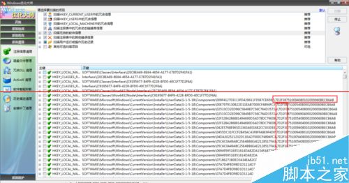 2、先說說找不到或者不知道有沒有找全這種情況。這里我利用的是優化大師的注冊信息清理里面的查找目標這個功能,其實也可以直接用注冊表自帶的搜索功能,但是它只能找完一個再進行下一個搜索。這里我們在目標字符串框填“7D2F”,把下面 大小寫匹配等三個框框都勾選,然后點擊確定進行搜索。