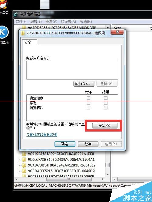 7、接著,我們可以看到里面的“組和用戶名”是空白的,點擊“高級”,系統繼續跳出“您沒有權限查看XXX的目前權限設置,但是您可以更改權限”這句提示,繼續確定。