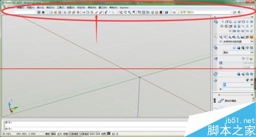 一、界面的上方的工具欄主要有兩個部分:①最上方的下拉菜單中包括了繪圖以及圖形處理的所有命令 ②第二層是部分快捷鍵,包括:文件的保存、打開;視口的縮放、拖動;以及圖層管理器