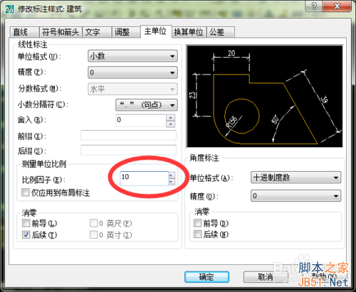 6、如需要按1:10進行標注,則將比例因子改為10,單擊確定,如修改前標注尺寸為900,在修改后標注尺寸為9000