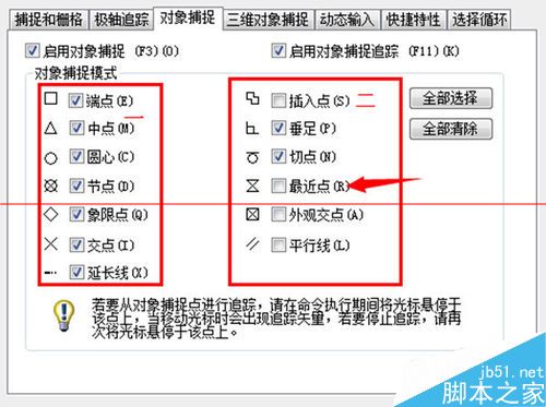 TT 臨時追蹤點 FROM 從臨時參照到偏移 ENDP 捕捉到圓弧或線的最近端點 MID 捕捉圓弧或線的中點 INT 線、圓、圓弧的交點 APPINT 兩個對象的外觀交點 EXT 線、圓弧、圓的延伸線 CEN 圓弧、圓心的圓心 QUA 圓弧或圓的象限點 TAN 圓弧或圓的限象點 PER 線、圓弧、圓的重足 PAR 直線的平行線 NOD 捕捉到點對象 INS 文字、塊、形、或屬性的插入點 NEA 最近點捕捉