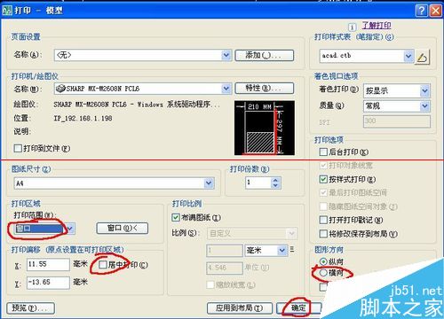 4、在打印范圍中選擇“窗口”。在圖紙尺寸選擇你想要打印多大的紙張。我選的A4紙張。