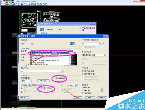 2.找到打印機設置選項,點擊進去,選擇你電腦連接的打印機驅動名稱并選擇,然后將布滿圖紙,居中打印及打印線寬的選項勾勾上,點擊確定。