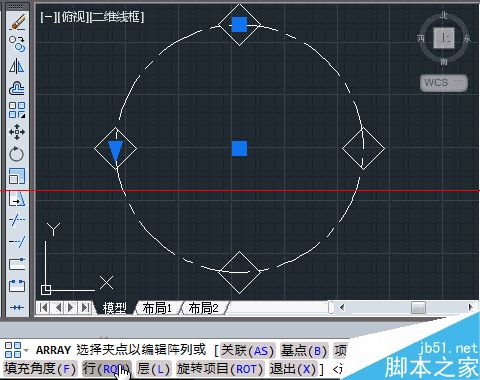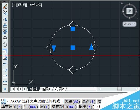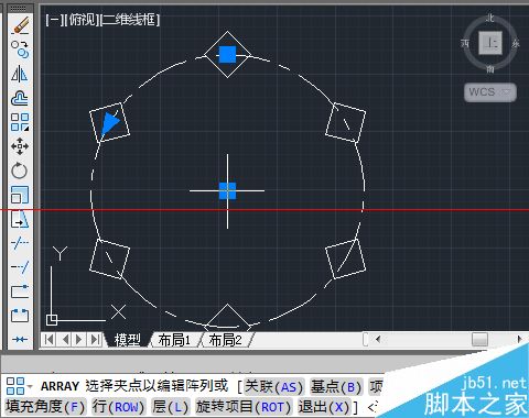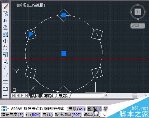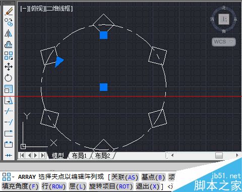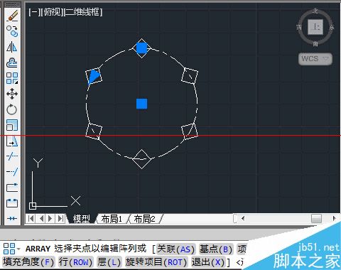 4、上一步中心點選定后,繪圖區(qū)域顯示了在輔助圓周上,均勻地分布著6個正方形。命令欄出現(xiàn)了“選擇夾點以編輯陣列或 [關(guān)聯(lián)(AS)/基點(B)/項目(I)/項目間角度(A)/填充角度(F)/行(ROW)/層(L)/旋轉(zhuǎn)項目(ROT)/退出(X)]”的指令。