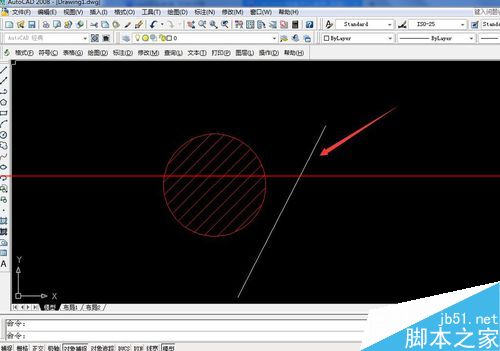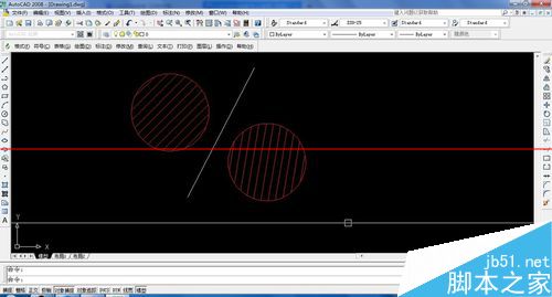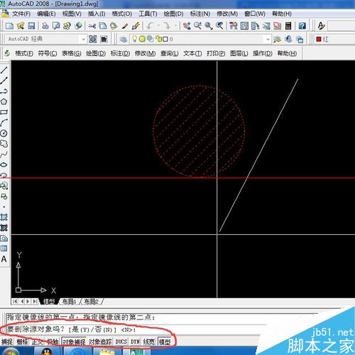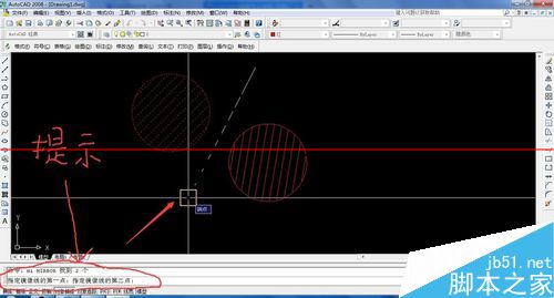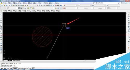 4、接著就是選擇鏡像的對稱軸第一點的位置,這就是我們之前畫好的那條直線,選中斜線的一個端點點擊鼠標左鍵