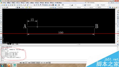 首先,我們在cad中繪制出一條100個圖形單位的直線。A點為直線左端點,B點為直線右端點。下面介紹如何精確捕捉在直線距離A點為15個圖形單位的點。