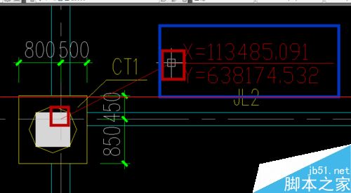 9、然后點擊樁號中兩軸線的交點,再引出到空白處確定,即點擊兩下,就對其樁的坐標標注完成