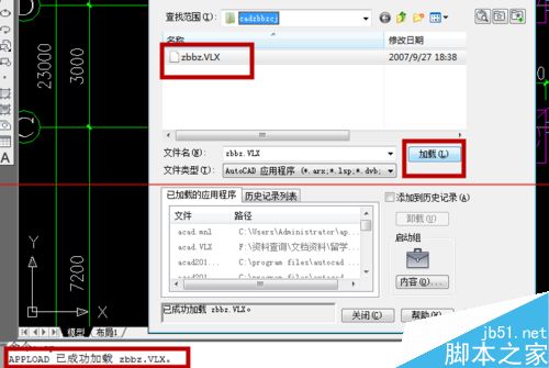 6、在”名稱“欄選中”zbbz”,然后點擊中間的“加載”,底下命令欄提示“加載成功”,然后我們點擊”加載應用程序“對話框中的”關閉“