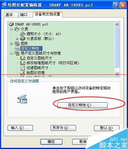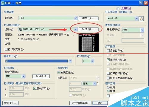 4、為了快捷打印,我們可以設置“頁面設置”為上一次打印“。在選擇好的打印機邊上的”特性“點擊。設置”自定義特性“——總是從A3口進紙,都打印A3的情況下。