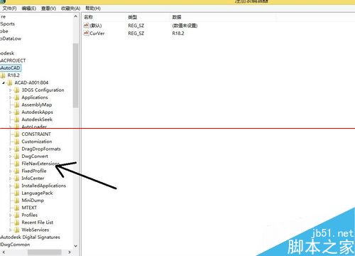 6、點開”AutoCad",會出現“R18.2”或者相應的標志。再找到“ACAD_A001:804",在下面的欄目的”FileNavExtensions“。