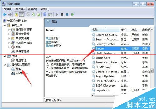 2、來到計算機管理界面,在左側欄找到“服務”并點擊,在右側欄中通過拖動滾動條找到“Server”服務,并確定已經設置為自動啟動。如果沒有請設置為自動啟動。
