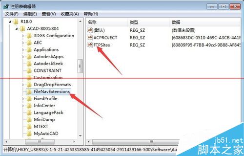 4、注冊表編輯器被打開,搜索,當搜到的路徑類似以下格式時:“HKEY_CURRENT_USER/Software/Autodesk/AutoCAD/R18.0/ACAD-8001:804/FileNavExtensions”(中間數字可能因人而異),我們通過“編輯”中的“查找”功能。