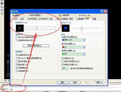 也可以手動(dòng)輸入命令“op”,回車。就能跳出“選項(xiàng)”框進(jìn)行“拾取框大小”的調(diào)節(jié)。