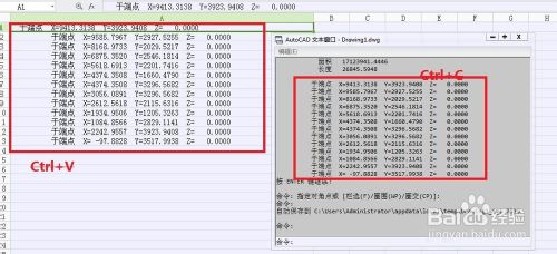 第二步:將CAD文本框中的數據復制到Excel中。選中文本框中的有效數據”Ctrl+C“,在打開的Excel中”Ctrl+V“。