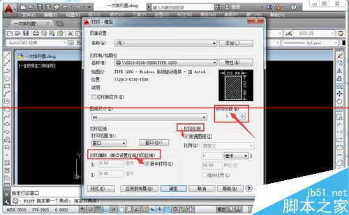 9、設置打印紙張的位置,一般只有一張圖紙時要居中打印,打印比例簡單點充滿圖紙就可以了,份數先打一份吧。