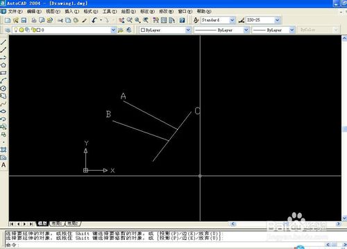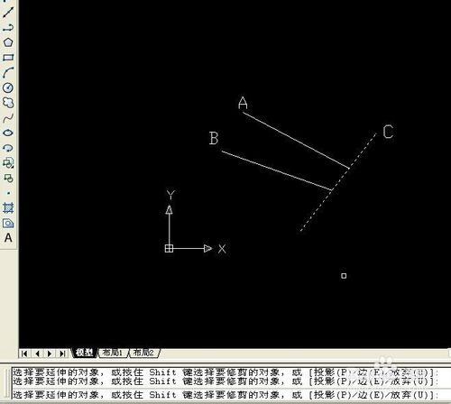 6、鼠標左鍵分別點擊線段A、B,線段A、B分別延伸至線段C上,如下圖: