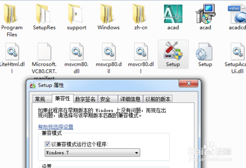 4、選擇acad.msi或setup.exe這個文件右鍵選擇屬性→兼容性→以兼容模式運行→確定