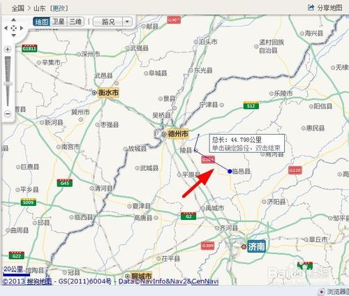 在陵縣點一下,在臨邑縣點一下,記下這個距離:31.3km②(不要看圖片上的數值,它包含多余的一段,就是陵縣后折出的一段),雙擊退出測距。