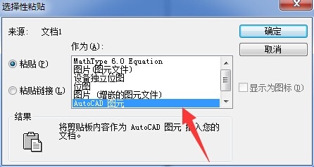 4、在彈出的“選擇性粘貼”對話框中選擇“AutoCAD圖元”,然后點擊“確定”: