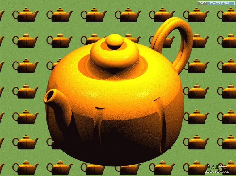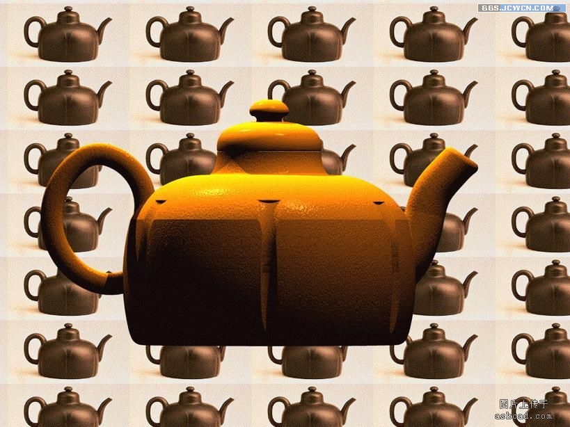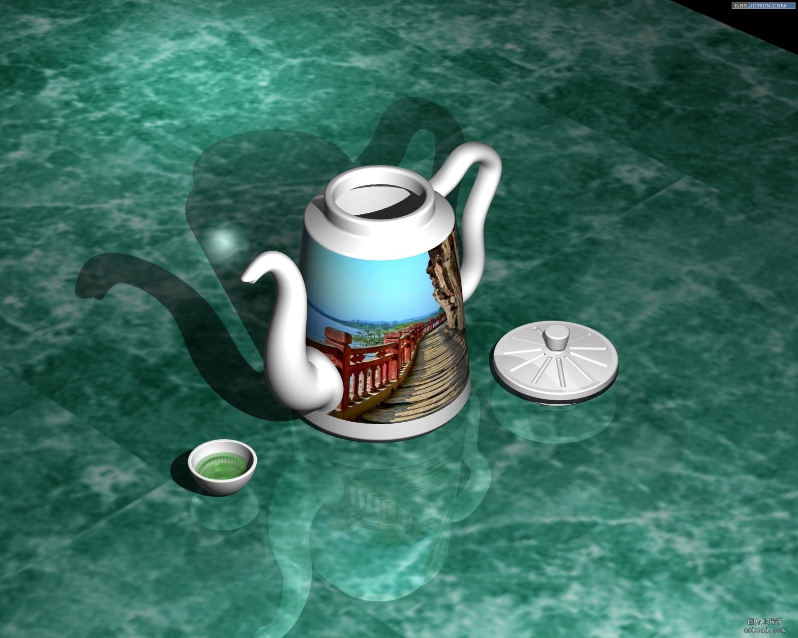 對于這個壺,是沿壺身貼的圖片,是先把小壺加上不同的顏色,用的是按aci附著材質,這個前幾集中已經說過了。總體上是沒有多少難度的,大家都可以試試看,渲染時可適度增加大理石桌面的反光,用光線跟蹤渲染后,就隱約可見桌面的倒影。