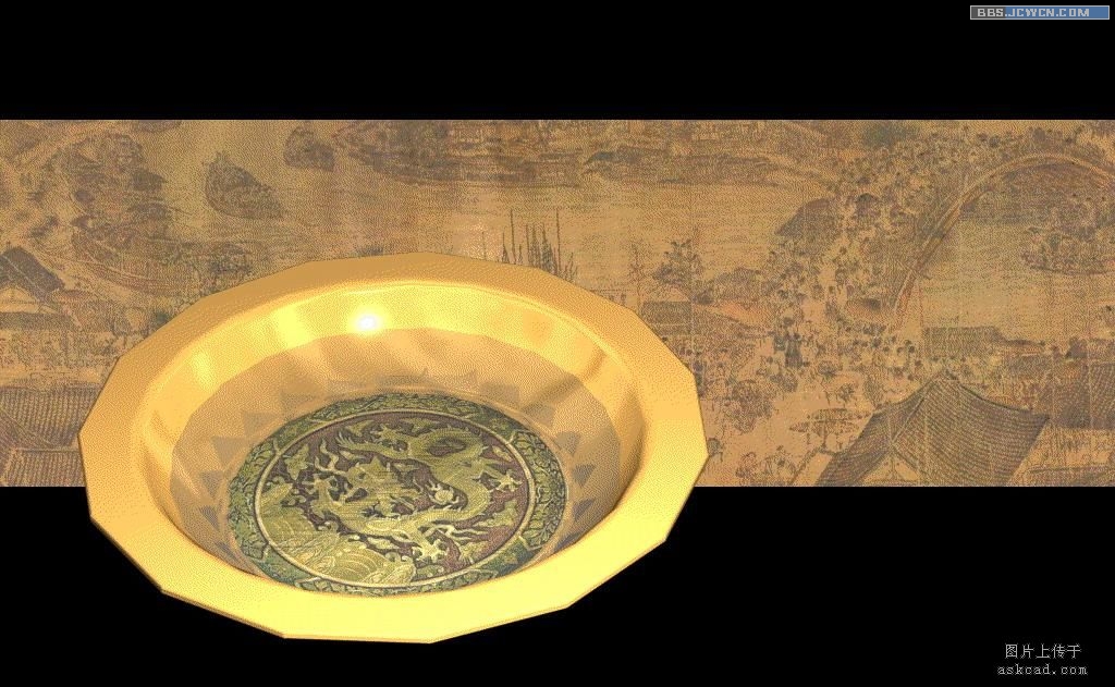 在渲染上,大家都能看明白了。可以有初學朋友會問"盆中的水是如何做的呢?",這個簡單,"水"我用是實體旋轉,然后用透明材質(glass)。至于盆底的圖,與背景都是插入的。