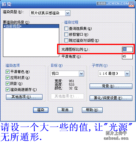 3、渲染對話框中的陰影選項必須勾上,注意用一般渲染是沒有陰影的;
