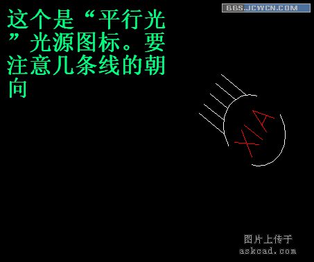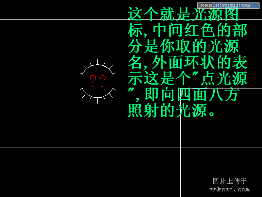 答:建立了光源后,通常都是有光源圖標的,請在線框模式中查看,因為在面著色與體著色中,不容易觀察到,光源圖標在系統(tǒng)默認中是非常小的,象個"雜點",我也說過幾次了,不能把它當成垃圾來刪除!