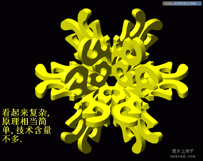 這就是三維的難點了,說到底是思維上未有突破所致,這種情況是沒有根本靈丹妙藥的,世界也沒有一種方法只要看了后,一切就迎刃而解,經(jīng)驗在于點滴積累。這個小題目也就是對初學(xué)三維朋友的一個好的練習,相信只要你肯去做,肯畫出實體來,這對思維是種提高,而且將享受到三維對稱圖形帶來的美感。畫不了幾個,就能從中摸索出一些套路出來了,這個就叫"經(jīng)驗",不要認為現(xiàn)在用不著,沒什么意思,這種就事論事的看問題對于學(xué)cad是不對的。
