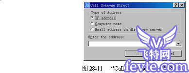 ? "Call Someone Direct(直接呼叫某人)":顯示"Call Someone Direct(直接呼叫某人)"對話框,如圖28-11所示。在該對話框中,用戶可直接通過對方的IP地址(IP address)、計算機名(Computer name)或目錄服務器上的電子郵件地址(Email address on directory server)進行呼叫。