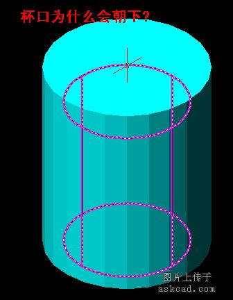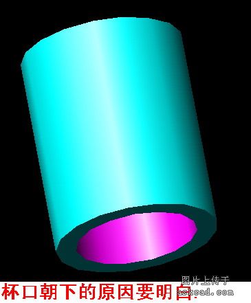 現在明白如何是倒著的杯子了吧,因為畫大圓柱與小圓柱的起始位置在同一面上,而畫的是一大一小的圓柱,當取差集時,就得到這樣的倒口杯子。如何解決呢,這就太簡單了,畫好兩個圓柱后,把小的移動到上面,再取差集就可以了。或者把倒口的杯子旋轉180度也得到正著的杯子。從這個基本操作可以看出,第一步要構思好思路,畫三維圖要不斷地檢驗自己的判斷能力,這是提高能力的好辦法,如何做呢?就在著手開畫時,想想最后得到怎樣的結果,是否和自己想的一致?如果說,每次都和自己頭腦構思的一致,說明你已經上路了。